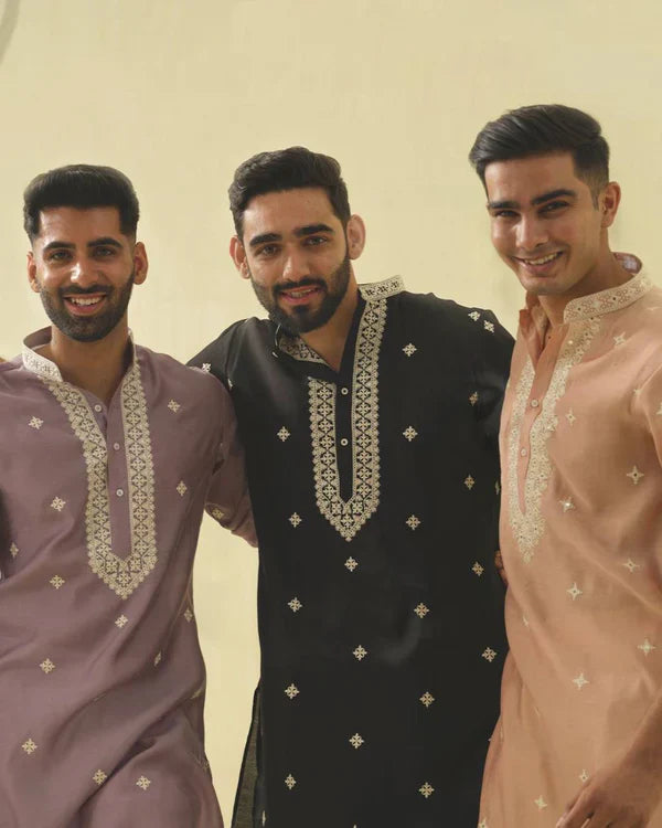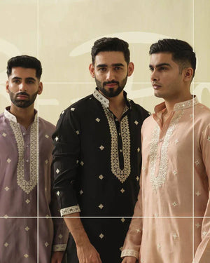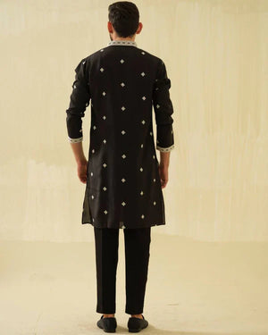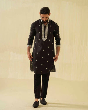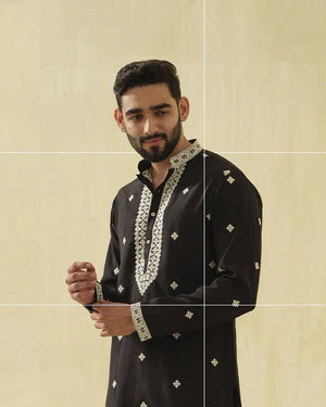 This Black Neck and Butti Embroidered Work Men's Kurta with Pajama Is Created by KURTA STUDIO ,This Hand-stitched Kurta Is Made of 100% Pure Cotton Fabric With Having embroidered work Over It. Our Attractive embroidery Add More Charm to Your Look, Wear This at Any Time Because the Fabric Is So Smooth to Skin That You Will Love It.