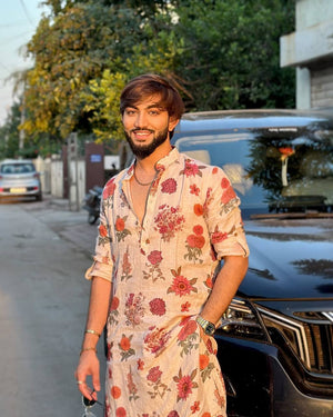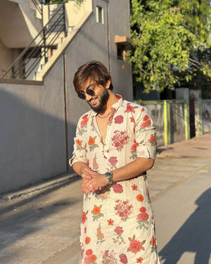IVORY ROSE PRINTED KURTA PAJAMA SET FOR MEN'S