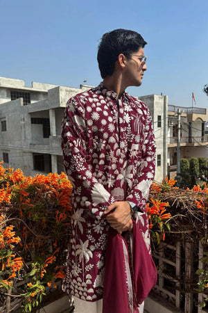 This Marron Kurta-Patilaya set is beautifully adorned with white thread work, adding a touch of elegance to your wardrobe. Made with high-quality materials and expert craftsmanship, this set is perfect for any formal or special occasion. The intricate design and comfortable fit make it a must-have for any fashion-forward individual.