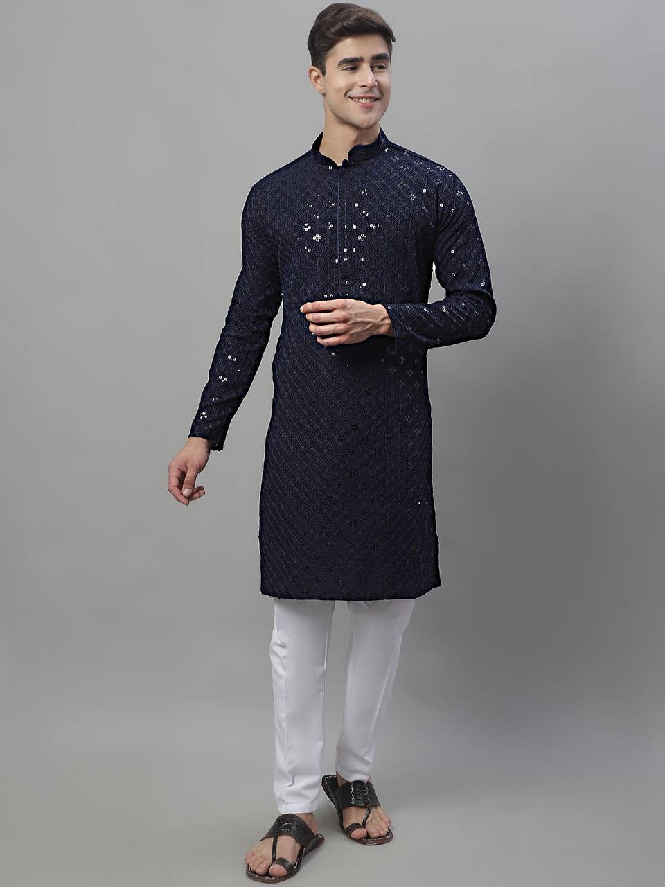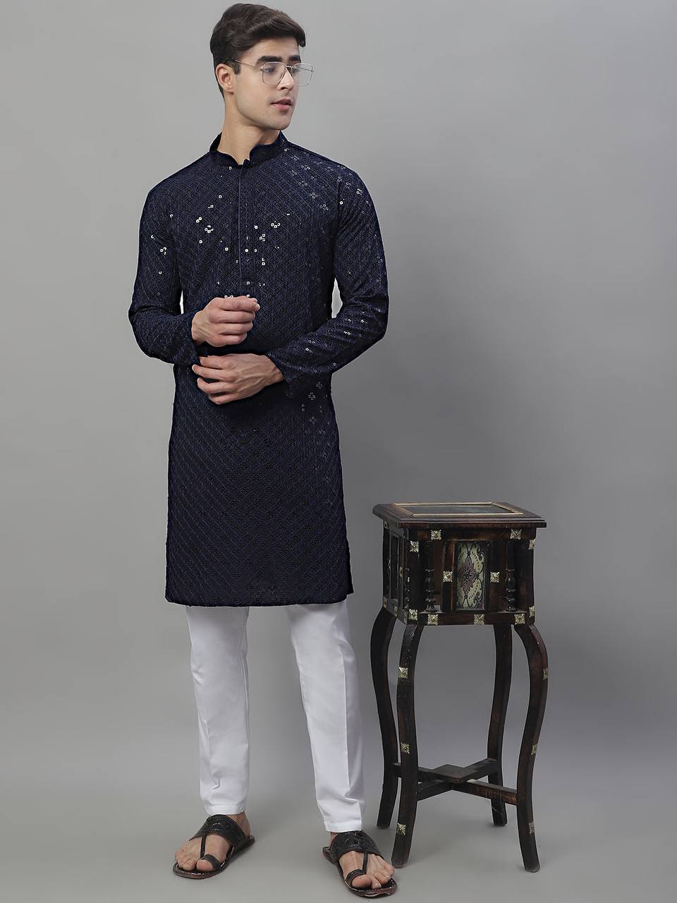 NAVY BLUE CHIKANKARI EMBROIDERED AND SEQUENCE KURTA WITH PAJAMA