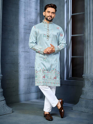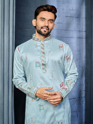 SKY BLUE MULTI THREAD EMBROIDERY DEER PATTERN DAAMAN CONCEPT KURTA
