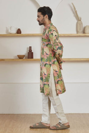 PINK WOVEN MUGHAL GARDEN AND BIRD PRINTED KURTA WITH PAJAMA SET FOR MEN