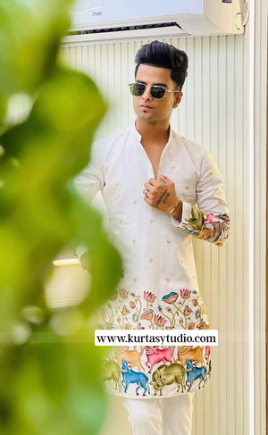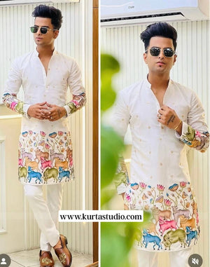 This white Cow n butti embroderd work Kurta With Pajama Is Created by KURTASTUDIO ,This full stitched Kurta Is Made of 100% Pure Cotton Fabric With Having Hand digital Printed Prints Over It. Our Attractive Prints Add More Charm to Your Look, Wear This at Any Time Because the Fabric Is So Smooth to Skin That You Will Love It.